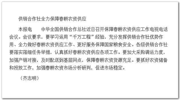 中華全國供銷合作總社近日召開保障春耕農資供應工作電視電話會議。會議要求,要學習運用“千萬工程”經驗,充分發揮供銷合作社優勢作用、全力做好春耕農資供應工作、更好服務保障國家糧食安全。各級供銷合作社要落實落細任務舉措,認真抓好春耕農資供應各項工作。要加大采購調運力度,加強產銷對接,及時配送到基層網點,保障春耕農資貨源充足。要抓好農資儲備和投放工作,加強春耕農資市場分析研判,促進市場穩定。